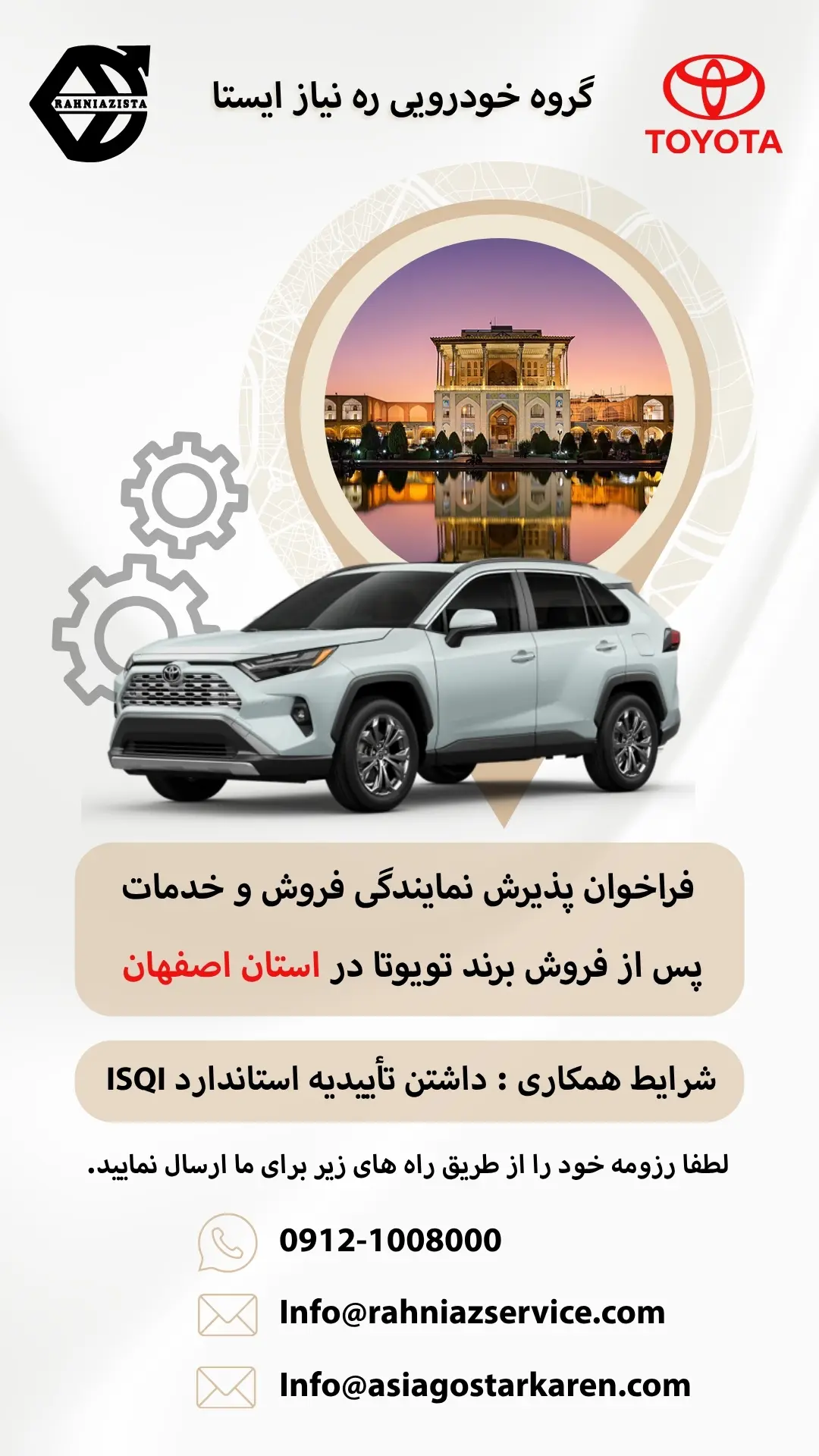 شرکت گروه خودروسازی ره نیاز ایستا، نماینده فروش و خدمات خودروهای تویوتا در ایران، با افتخار فراخوان پذیرش نمایندگی خود را اعلام میکند. اگر شما علاقهمند به همکاری هستید، این فرصت ویژه را از دست ندهید. ما به دنبال نمایندگانی متعهد، متخصص و باتجربه در زمینه فروش و خدمات خودرو هستیم که بتوانند خدماتی باکیفیت به مشتریان ارائه دهند.